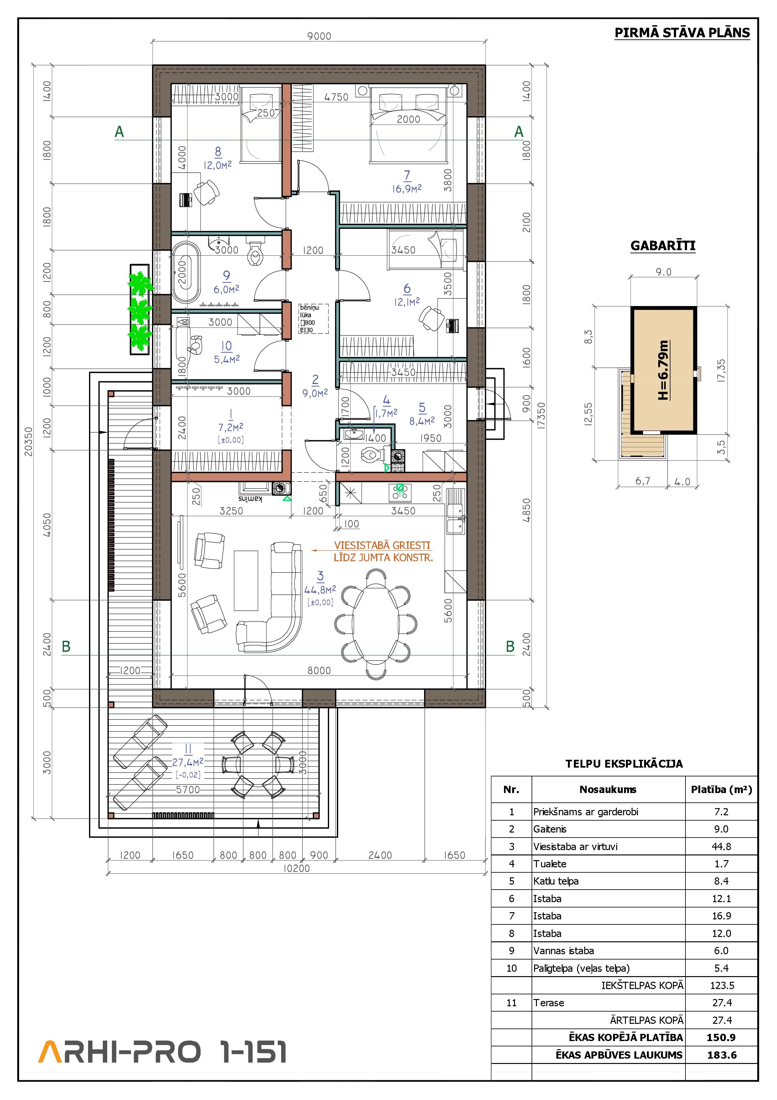 gāzbetona mūris BAUROC EcoTerm+ 300mm (300kg/m³). Ārsienas papildus siltinātas ar fasāžu cieto minerālvati PAROC Linio 150mm