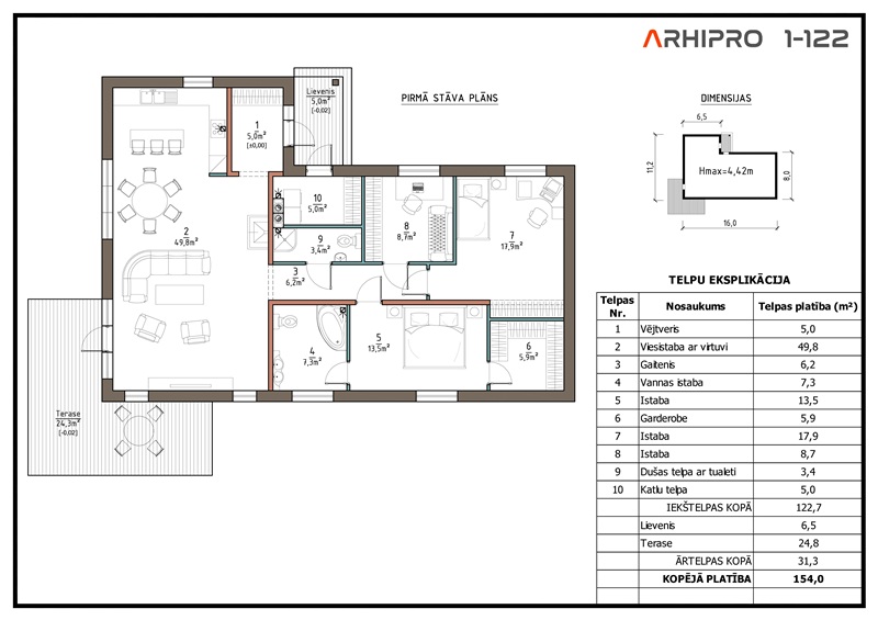 Vienstāvīga ģimenes māja ar terasi, bez garāžas.