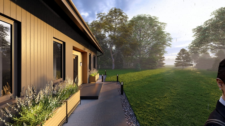 • Logi: pakešu logi koka vai PVC rāmjos ar trīskārša stiklojuma paketi (URM vērtība, W/(m2K) 1,10).