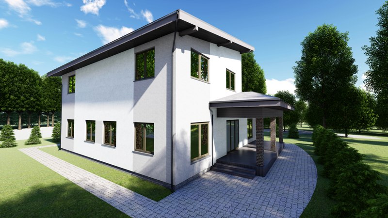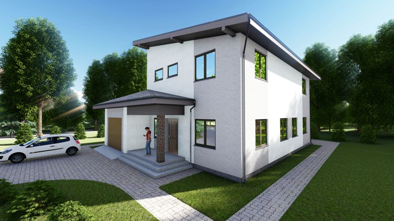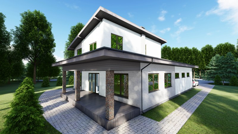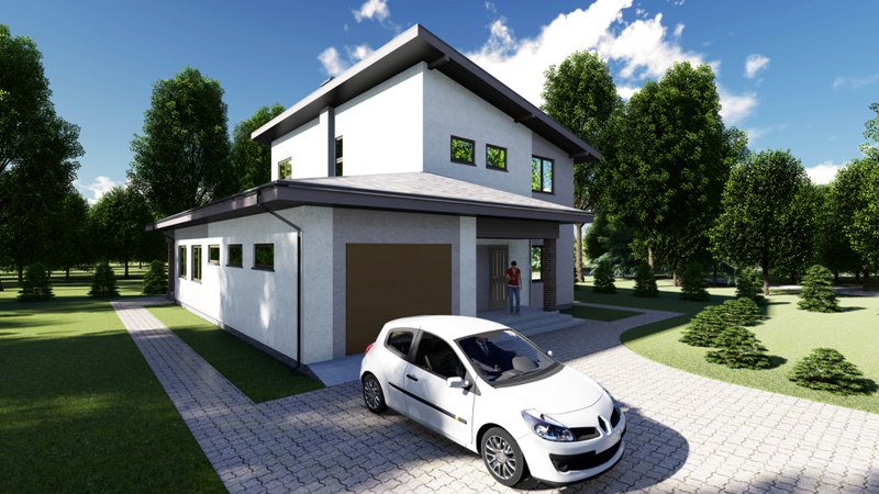 Divstāvu ģimenes māja ar pilniem diviem stāviem, iebūvētu garāžu un terasei zem jumta.
